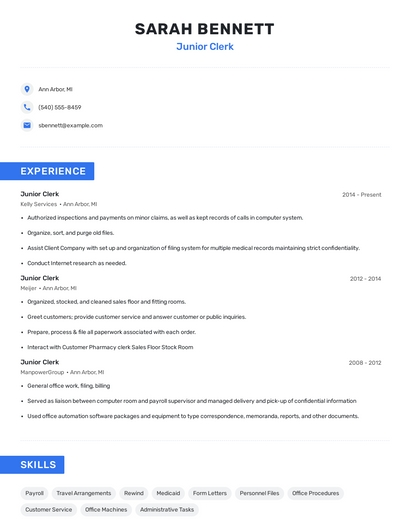 Choose from 10+ customizable junior clerk resume templates