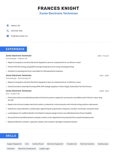 The most important skills for a junior electronic technician resume and required skills for a junior electronic technician to have include: