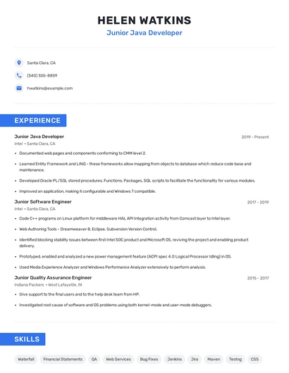 Build a professional junior java developer resume in minutes. Browse through our resume examples to identify the best way to word your resume. Then choose from 5+ resume templates to create your junior java developer resume.