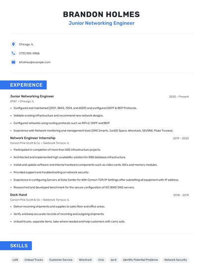 Build a professional junior networking engineer resume in minutes. Browse through our resume examples to identify the best way to word your resume. Then choose from 5+ resume templates to create your junior networking engineer resume.