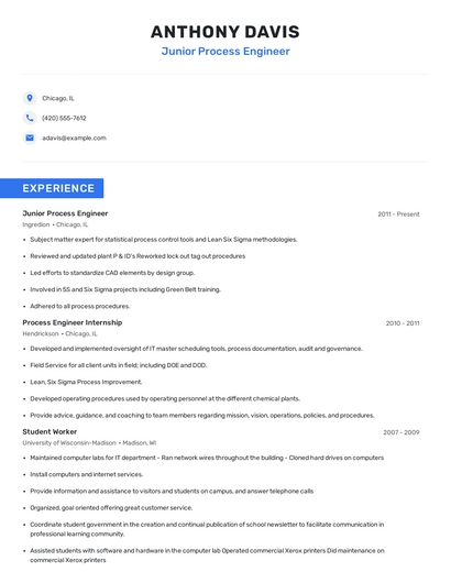 Build a professional junior process engineer resume in minutes. Browse through our resume examples to identify the best way to word your resume. Then choose from 5+ resume templates to create your junior process engineer resume.