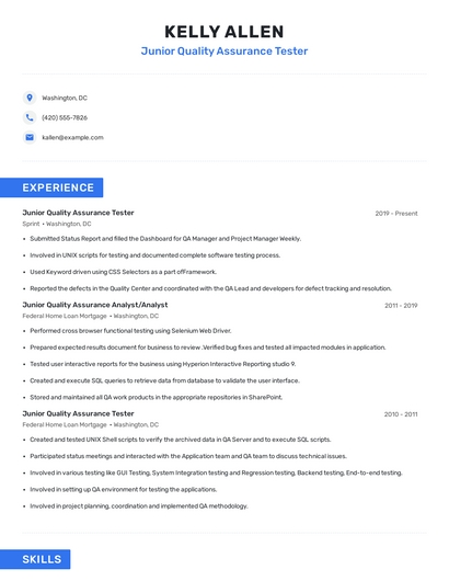 Build a professional junior quality assurance tester resume in minutes. Browse through our resume examples to identify the best way to word your resume. Then choose from 5+ resume templates to create your junior quality assurance tester resume.