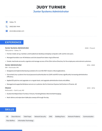 Build a professional junior systems administrator resume in minutes. Browse through our resume examples to identify the best way to word your resume. Then choose from 5+ resume templates to create your junior systems administrator resume.