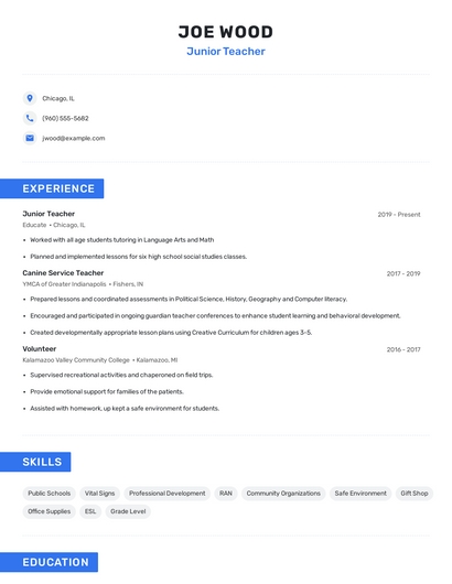 Build a professional junior teacher resume in minutes. Browse through our resume examples to identify the best way to word your resume. Then choose from 5+ resume templates to create your junior teacher resume.