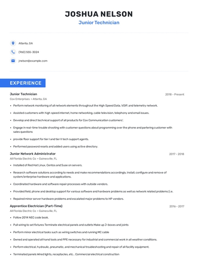 Build a professional junior technician resume in minutes. Browse through our resume examples to identify the best way to word your resume. Then choose from 5+ resume templates to create your junior technician resume.