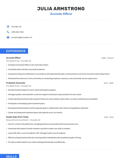 Build a professional juvenile officer resume in minutes. Browse through our resume examples to identify the best way to word your resume. Then choose from 5+ resume templates to create your juvenile officer resume.