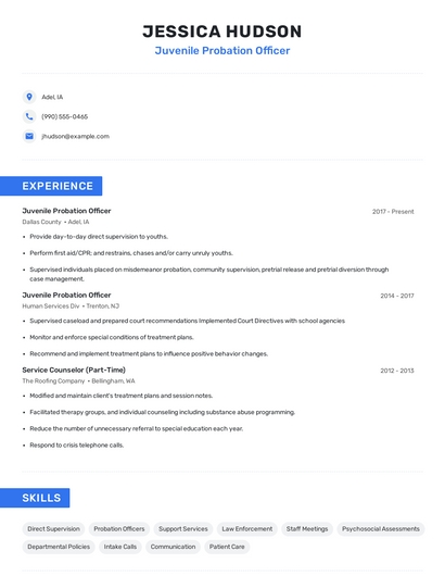 Build a professional juvenile probation officer resume in minutes. Browse through our resume examples to identify the best way to word your resume. Then choose from 5+ resume templates to create your juvenile probation officer resume.