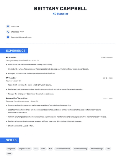Build a professional k9 handler resume in minutes. Browse through our resume examples to identify the best way to word your resume. Then choose from 5+ resume templates to create your k9 handler resume.