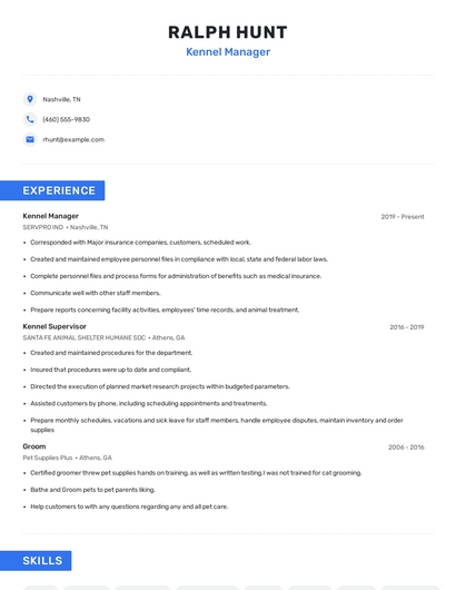 Build a professional kennel manager resume in minutes. Browse through our resume examples to identify the best way to word your resume. Then choose from 5+ resume templates to create your kennel manager resume.