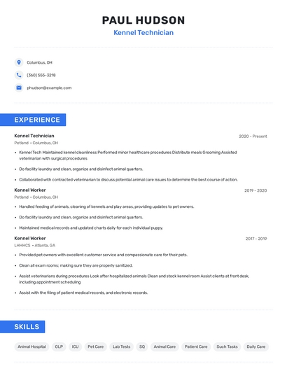 Build a professional kennel technician resume in minutes. Browse through our resume examples to identify the best way to word your resume. Then choose from 5+ resume templates to create your kennel technician resume.