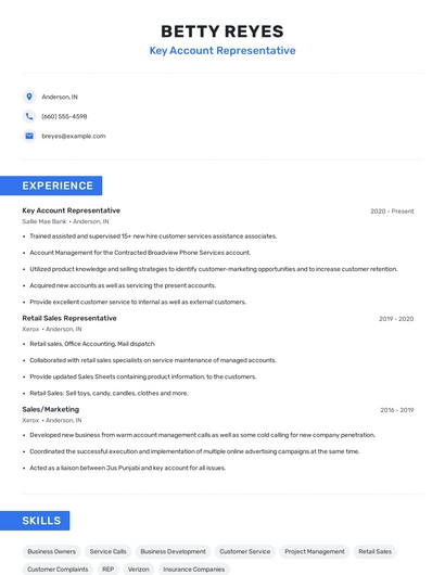 Build a professional key account representative resume in minutes. Browse through our resume examples to identify the best way to word your resume. Then choose from 5+ resume templates to create your key account representative resume.