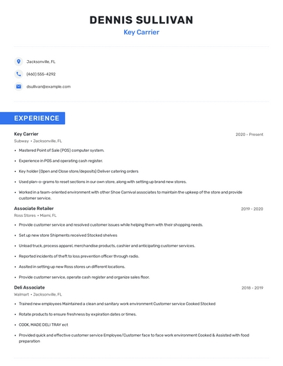 Build a professional key carrier resume in minutes. Our AI resume writing assistant will guide you through every step of the process, and you can choose from 10+ resume templates to create your key carrier resume.7. POS