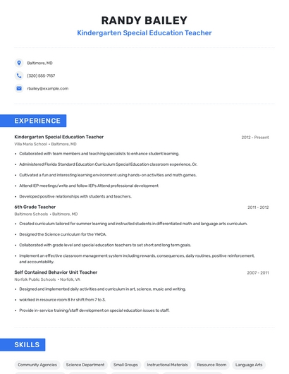Build a professional kindergarten special education teacher resume in minutes. Browse through our resume examples to identify the best way to word your resume. Then choose from 5+ resume templates to create your kindergarten special education teacher resume.