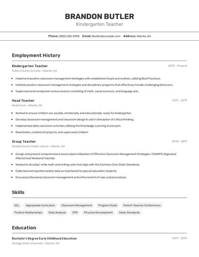 Here are some examples of good education entries from kindergarten teacher resumes: