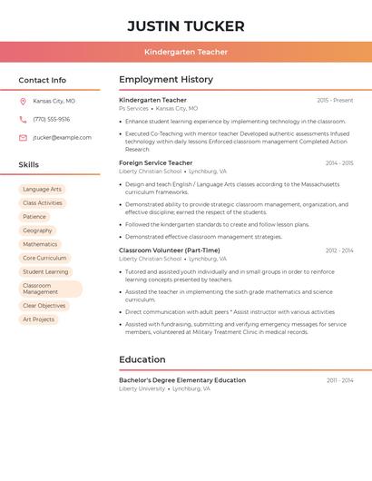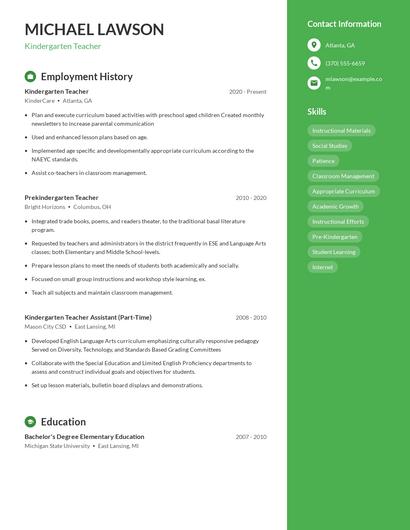 Here are example skills to include in your “Area of Expertise” on a kindergarten teacher resume:
