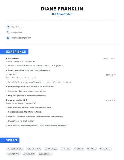 Build a professional kit assembler resume in minutes. Browse through our resume examples to identify the best way to word your resume. Then choose from 5+ resume templates to create your kit assembler resume.