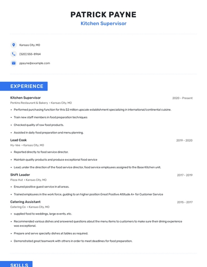 Build a professional kitchen supervisor resume in minutes. Browse through our resume examples to identify the best way to word your resume. Then choose from 5+ resume templates to create your kitchen supervisor resume.
