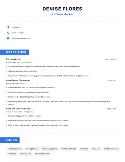 Build a professional kitchen worker resume in minutes. Browse through our resume examples to identify the best way to word your resume. Then choose from 5+ resume templates to create your kitchen worker resume.