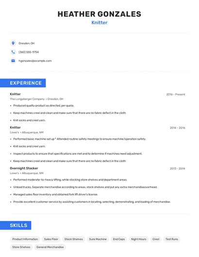 The most important skills for a knitter resume and required skills for a knitter to have include: