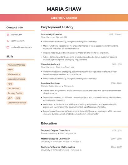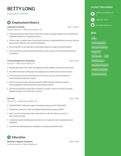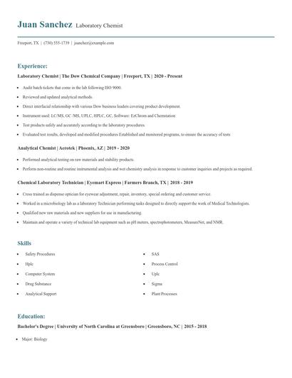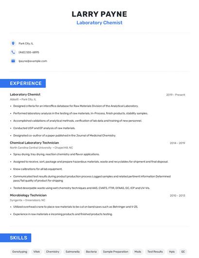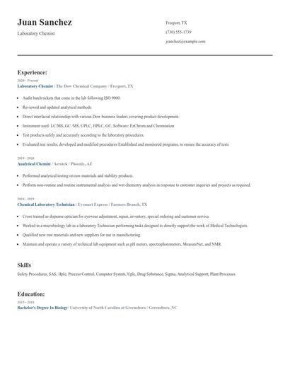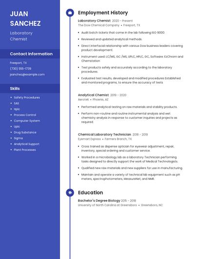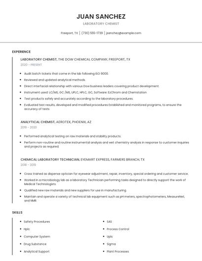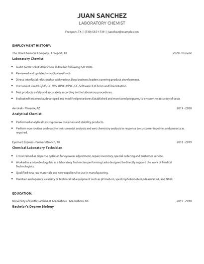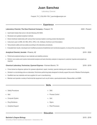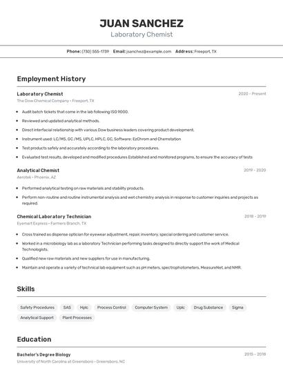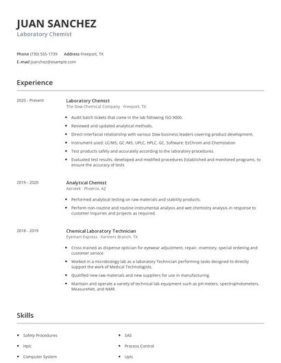 Build a professional laboratory chemist resume in minutes. Our AI resume writing assistant will guide you through every step of the process, and you can choose from 10+ resume templates to create your laboratory chemist resume.Compare different laboratory chemists