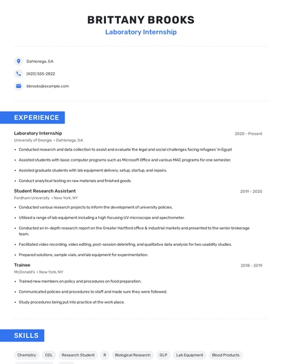 Build a professional laboratory internship resume in minutes. Browse through our resume examples to identify the best way to word your resume. Then choose from 5+ resume templates to create your laboratory internship resume.