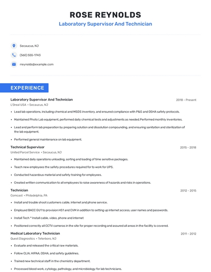 Build a professional laboratory supervisor and technician resume in minutes. Browse through our resume examples to identify the best way to word your resume. Then choose from 5+ resume templates to create your laboratory supervisor and technician resume.