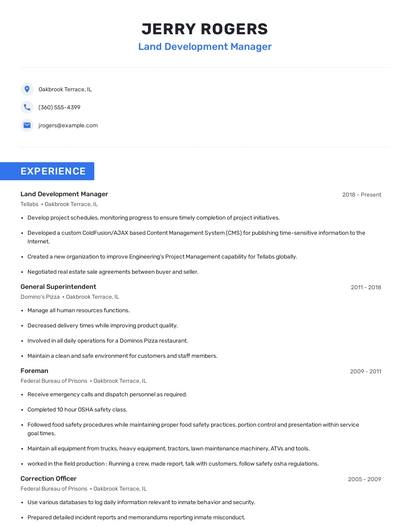 Build a professional land development manager resume in minutes. Browse through our resume examples to identify the best way to word your resume. Then choose from 5+ resume templates to create your land development manager resume.