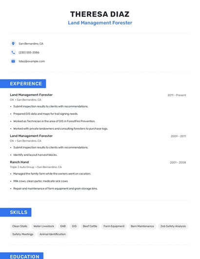 The most important skills for a land management forester resume and required skills for a land management forester to have include:
