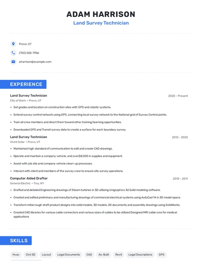 Build a professional land survey technician resume in minutes. Browse through our resume examples to identify the best way to word your resume. Then choose from 5+ resume templates to create your land survey technician resume.