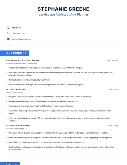 Build a professional landscape architect and planner resume in minutes. Browse through our resume examples to identify the best way to word your resume. Then choose from 5+ resume templates to create your landscape architect and planner resume.
