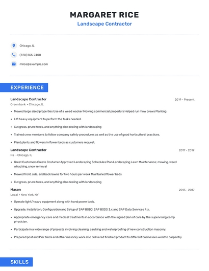 Build a professional landscape contractor resume in minutes. Browse through our resume examples to identify the best way to word your resume. Then choose from 5+ resume templates to create your landscape contractor resume.