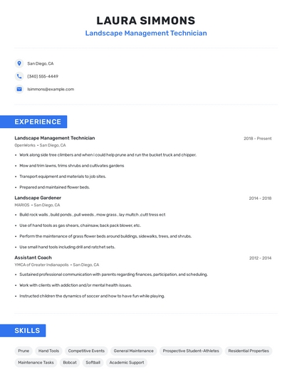 Build a professional landscape management technician resume in minutes. Our AI resume writing assistant will guide you through every step of the process, and you can choose from 10+ resume templates to create your landscape management technician resume.7. Irrigation Systems