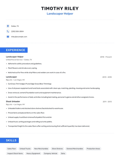 Build a professional landscaper helper resume in minutes. Browse through our resume examples to identify the best way to word your resume. Then choose from 5+ resume templates to create your landscaper helper resume.
