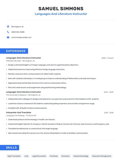 Build a professional languages and literature instructor resume in minutes. Our AI resume writing assistant will guide you through every step of the process, and you can choose from 10+ resume templates to create your languages and literature instructor resume.What skills help Languages And Literature Instructors find jobs?