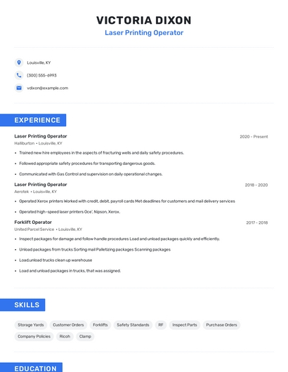 Build a professional laser printing operator resume in minutes. Browse through our resume examples to identify the best way to word your resume. Then choose from 5+ resume templates to create your laser printing operator resume.