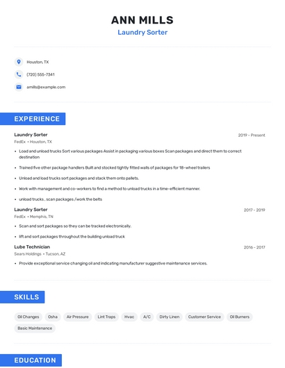 Build a professional laundry sorter resume in minutes. Our AI resume writing assistant will guide you through every step of the process, and you can choose from 10+ resume templates to create your laundry sorter resume.7. Washing Machines