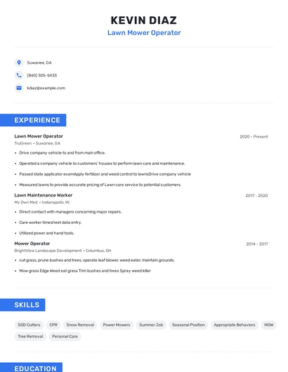 Build a professional lawn mower operator resume in minutes. Our AI resume writing assistant will guide you through every step of the process, and you can choose from 10+ resume templates to create your lawn mower operator resume.7. Rakes