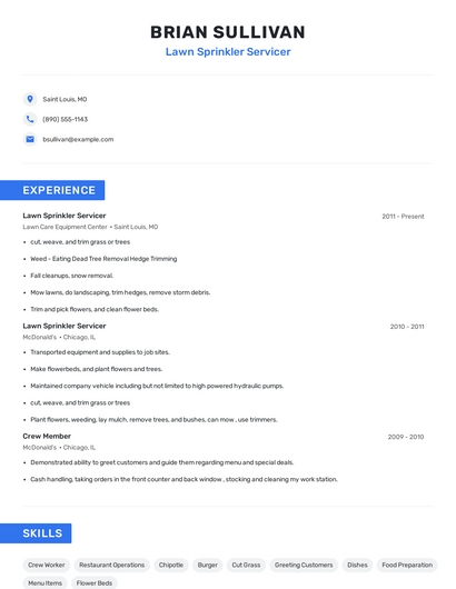 Build a professional lawn sprinkler servicer resume in minutes. Browse through our resume examples to identify the best way to word your resume. Then choose from 5+ resume templates to create your lawn sprinkler servicer resume.