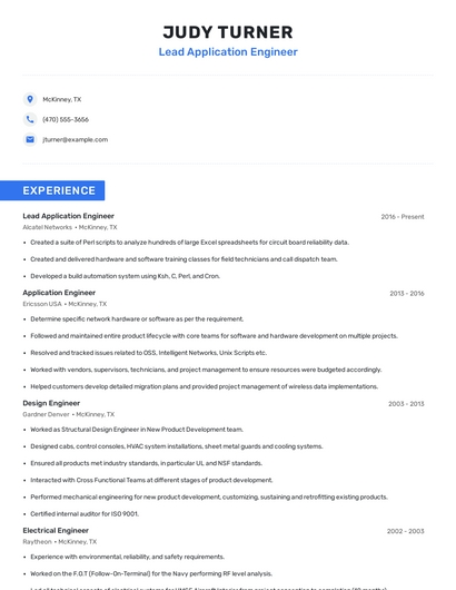 Build a professional lead application engineer resume in minutes. Browse through our resume examples to identify the best way to word your resume. Then choose from 5+ resume templates to create your lead application engineer resume.