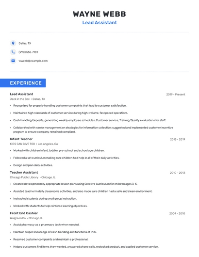 Build a professional lead assistant resume in minutes. Browse through our resume examples to identify the best way to word your resume. Then choose from 5+ resume templates to create your lead assistant resume.