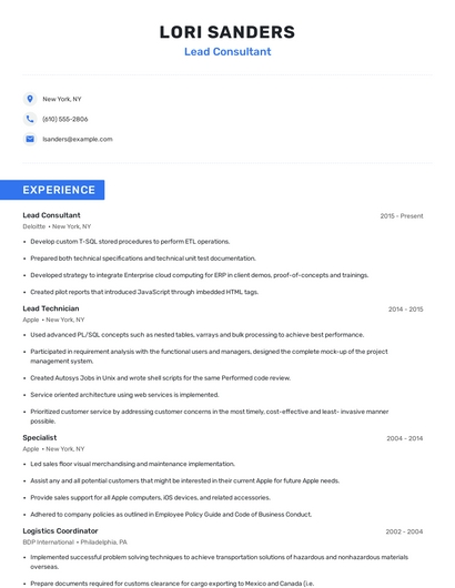 Build a professional lead consultant resume in minutes. Browse through our resume examples to identify the best way to word your resume. Then choose from 5+ resume templates to create your lead consultant resume.