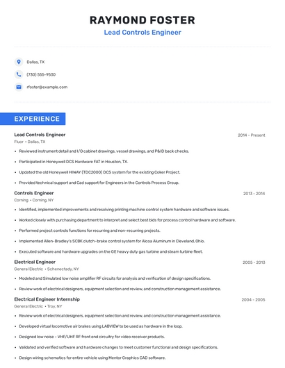 Build a professional lead controls engineer resume in minutes. Browse through our resume examples to identify the best way to word your resume. Then choose from 5+ resume templates to create your lead controls engineer resume.