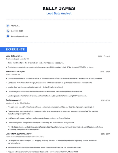 Build a professional lead data analyst resume in minutes. Browse through our resume examples to identify the best way to word your resume. Then choose from 5+ resume templates to create your lead data analyst resume.