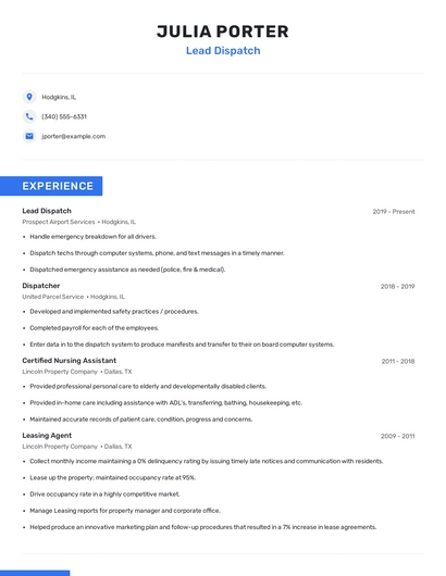 Build a professional lead dispatch resume in minutes. Browse through our resume examples to identify the best way to word your resume. Then choose from 5+ resume templates to create your lead dispatch resume.