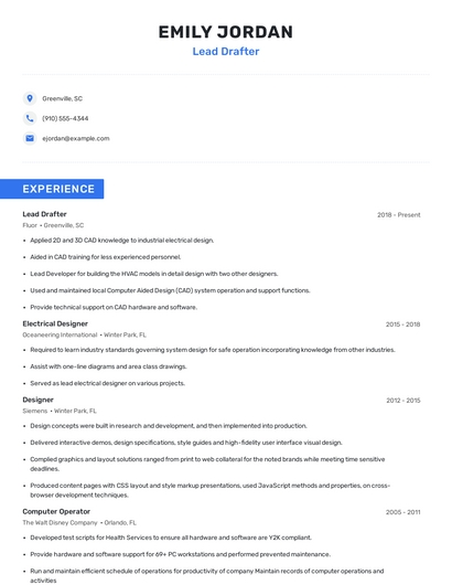 Build a professional lead drafter resume in minutes. Browse through our resume examples to identify the best way to word your resume. Then choose from 5+ resume templates to create your lead drafter resume.