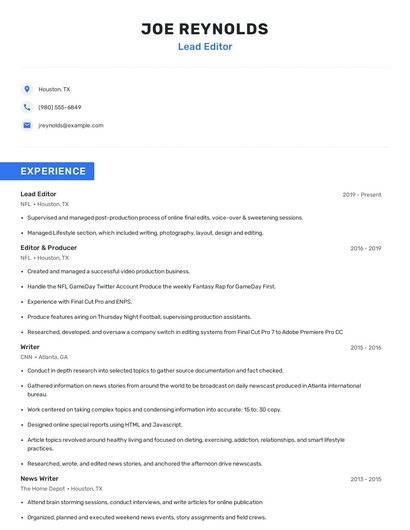 Build a professional lead editor resume in minutes. Browse through our resume examples to identify the best way to word your resume. Then choose from 5+ resume templates to create your lead editor resume.