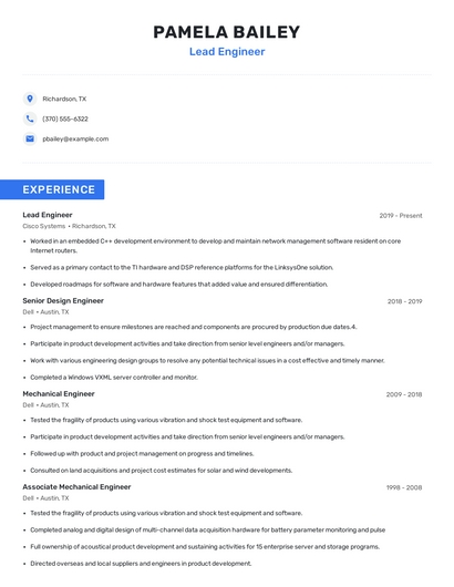 Build a professional lead engineer resume in minutes. Browse through our resume examples to identify the best way to word your resume. Then choose from 5+ resume templates to create your lead engineer resume.