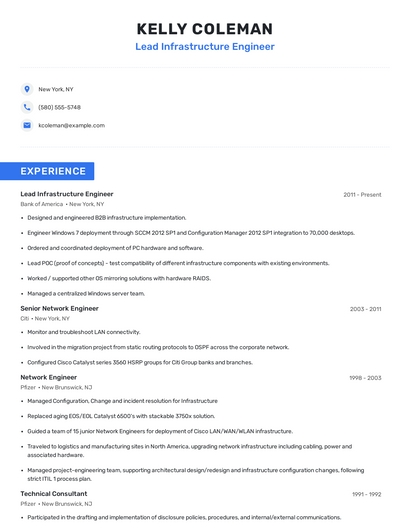 Build a professional lead infrastructure engineer resume in minutes. Browse through our resume examples to identify the best way to word your resume. Then choose from 5+ resume templates to create your lead infrastructure engineer resume.
