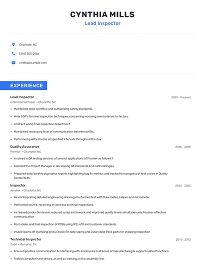 Build a professional lead inspector resume in minutes. Browse through our resume examples to identify the best way to word your resume. Then choose from 5+ resume templates to create your lead inspector resume.
