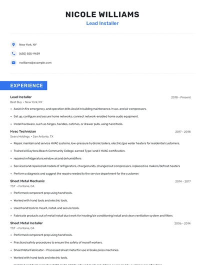 Build a professional lead installer resume in minutes. Browse through our resume examples to identify the best way to word your resume. Then choose from 5+ resume templates to create your lead installer resume.
